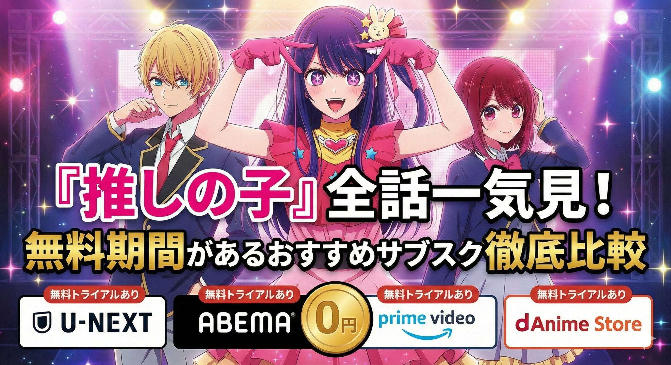 今の時代、動画配信サービスの「無料体験期間」を賢く使えば、『推しの子』を全話タダで見ることなんて余裕です。